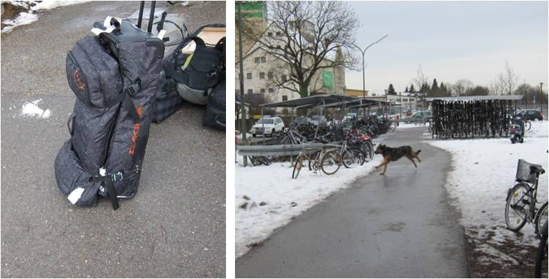 5 of our 6 bags ended up in Munich … the missing one of course with our 2011/2012 fleet of bindings. Doh! At least we budgeted an extra day before the show to deal with things like this so it wasn’t too much of a panic. Three train rides and three flights of stairs later (lugging 100lbs+ each) we made it to Feldkirchen where we were staying. Our warm welcome to Germany started off with a random dog peeing on Jeff’s bag, which was even funnier than it sounds when you’re sleep deprived.