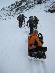 Our buddy Tom Whitfield checking in again from Antarctica. Hi Spark, Done something quite interesting the other day. I had made a stretcher and we decided to go out and test it in our pulk. It was a search and rescue exercise. We simulated a broken leg in the hills. We all gathered