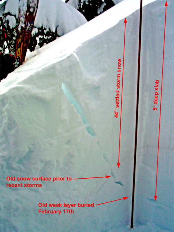 • A deep slab is essentially a persistent slab, but thicker (see previous post). The slab is going to be approaching 3 feet or more. Sometimes it can even involve the season’s entire snowpack. This strong slab is resting on a softer, persistent weak layer beneath.