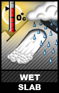 wet-slab-icon• The timing can vary throughout the day.  Slopes facing easterly (NE, E, SE) get first sun; southerly slopes are late morning and mid day (SE, S, SW); and westerly slopes get the afternoon heat (SW, W, NW).