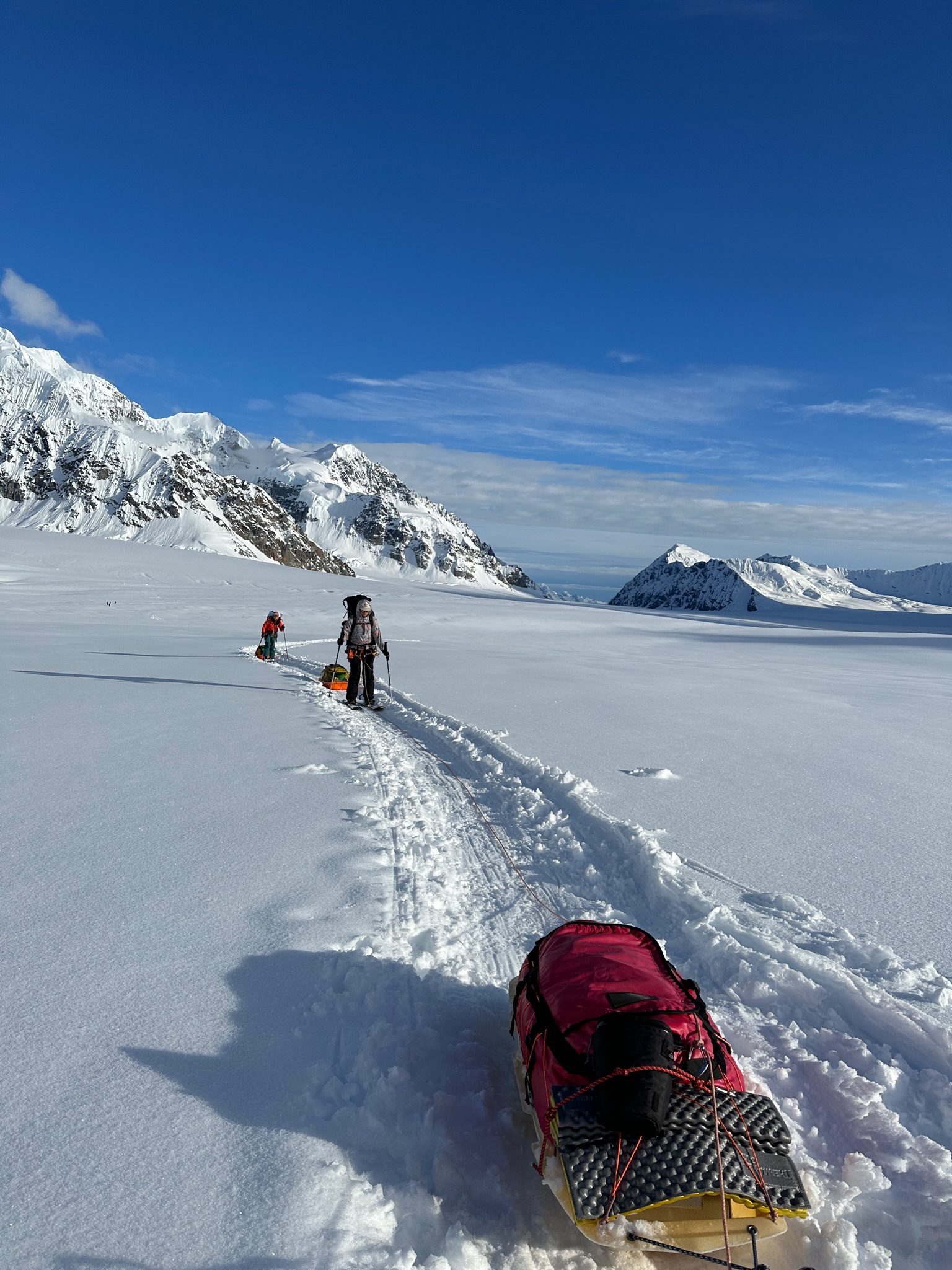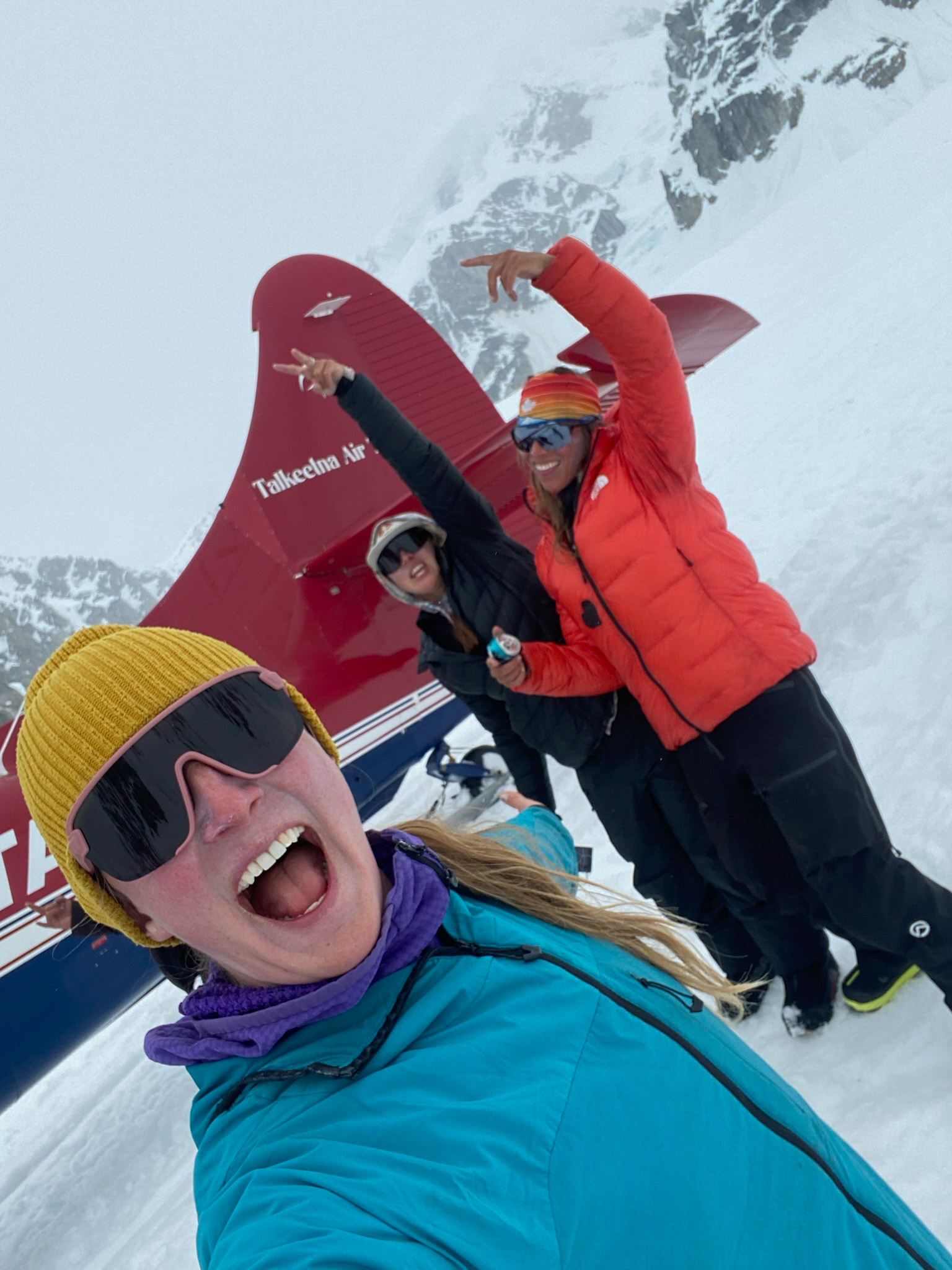 Powdery snow flies up on the sides of our airplane as we touch down on a fresh patch of airstrip on the Kahiltna Glacier. We had been waiting in Talkeetna for four days in the rain -  weighing our gear, packing, repacking, and commandeering the pilots' lounge while we waited for a weather window. Once out of the small Cessna ski plane the three of us hugged our pilot and rigged our sleds quickly. After roping ourselves to each other we started walking up the glacier in the late afternoon Alaskan sun.