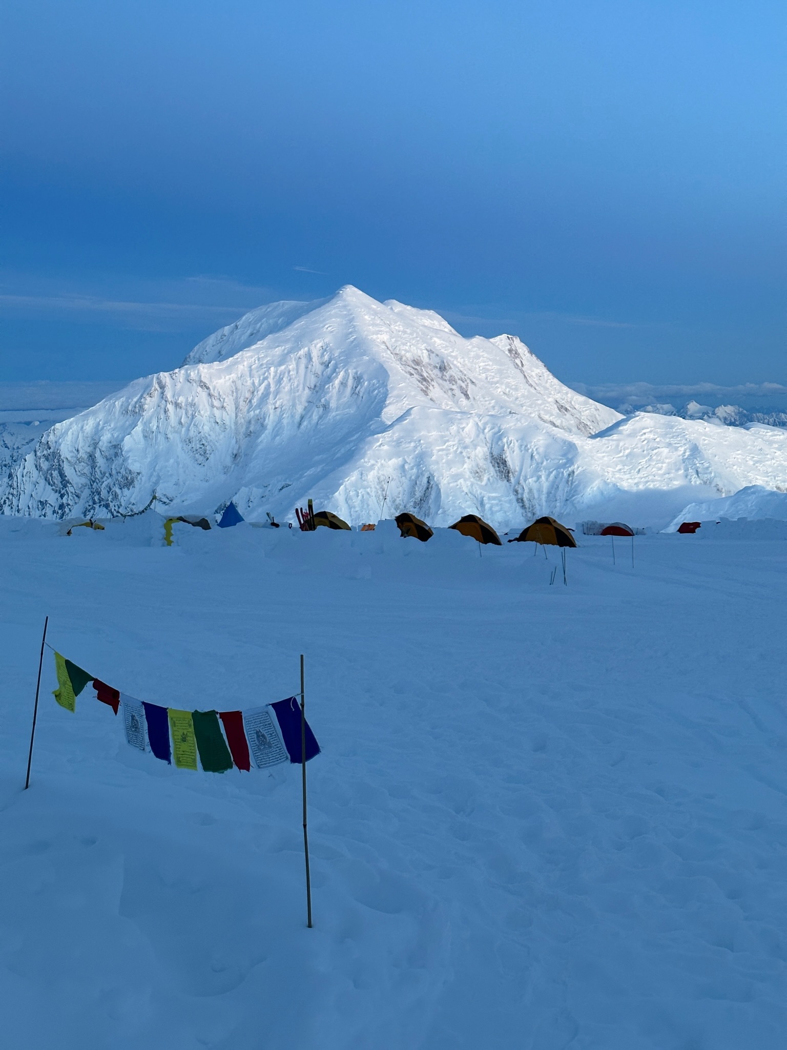 Mt. Foraker in either the early morning or late night sun, as viewed from our ‘patio’ at 14 Camp