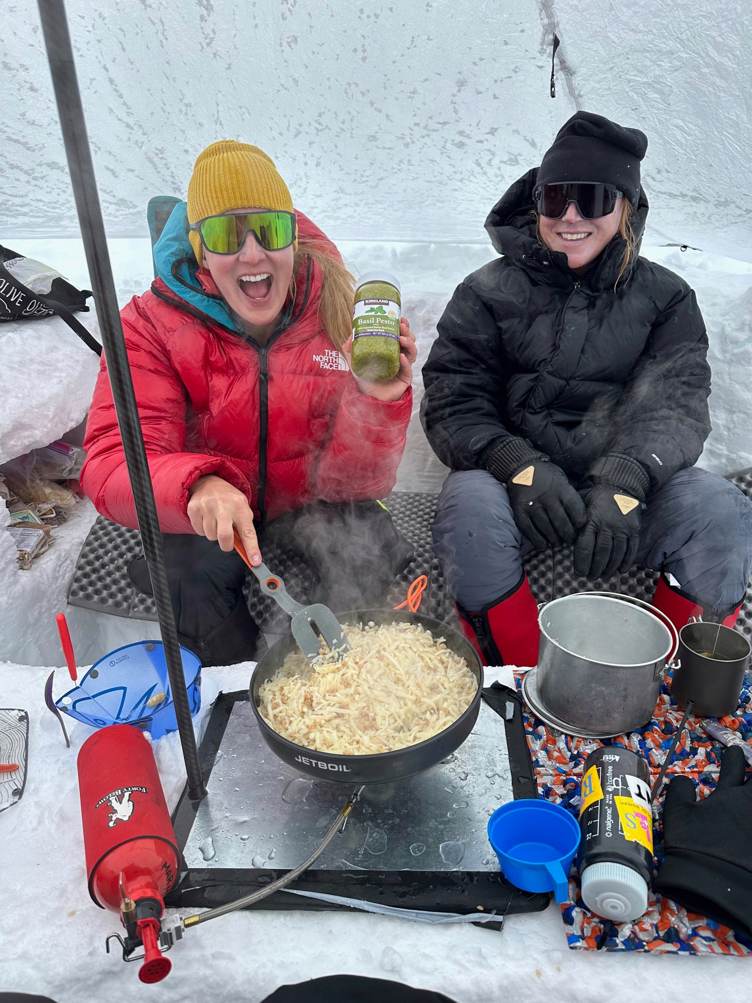 Kaytlyn making pesto and hash browns in the kitchen tent on a stormy day. Temps would drop to around -15 degrees Fahrenheit when it was cloudy.