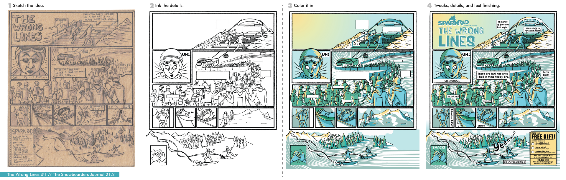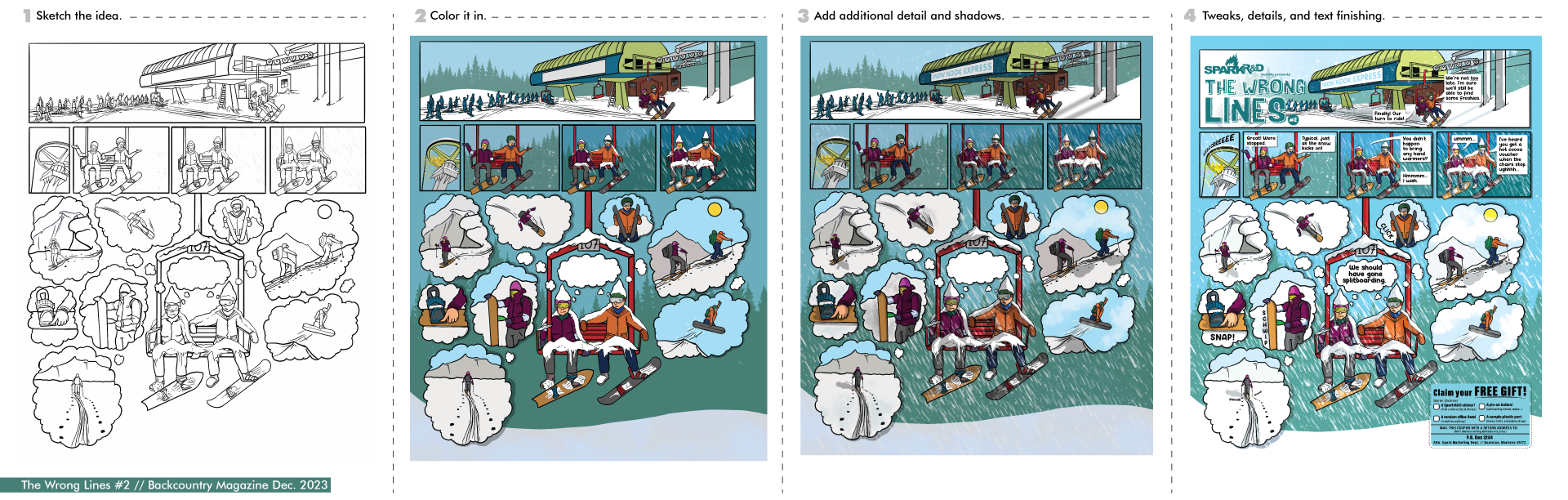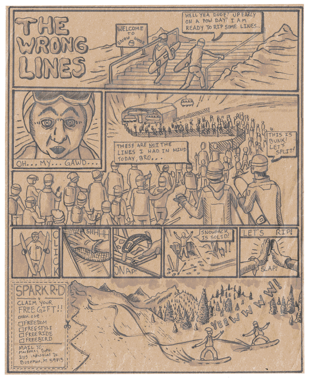 After some discussion, a comic-style ad became the obvious (and fun) choice. We brainstormed a number of less-than-ideal resort experiences and then began deciding which ones would resonate with our audience and could fit on a single page. And, just to be clear, this is all a bit tongue-in-cheek, as all of us at Spark, while we do love splitboarding, spend plenty of time at resorts riding chairs…and enjoy it.