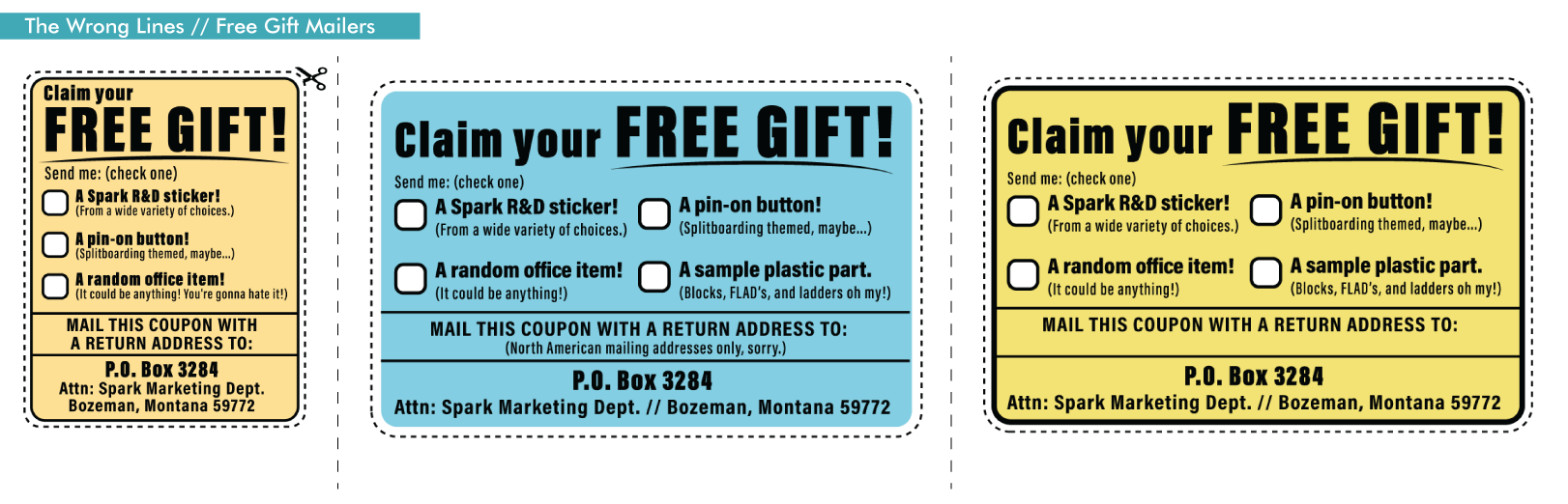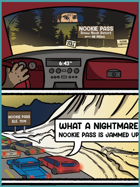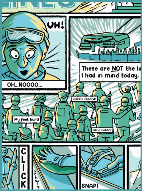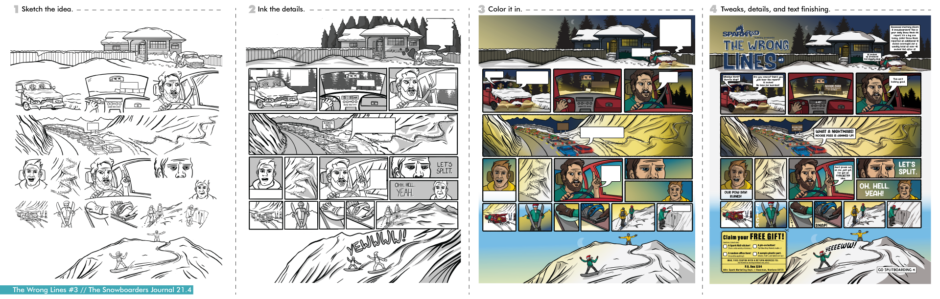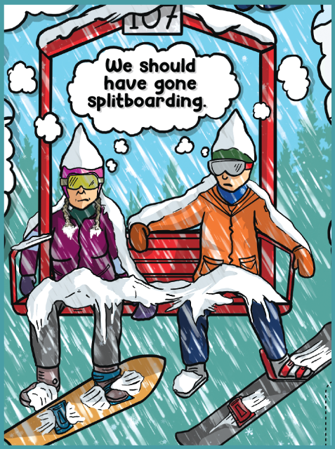 After some discussion, a comic-style ad became the obvious (and fun) choice. We brainstormed a number of less-than-ideal resort experiences and then began deciding which ones would resonate with our audience and could fit on a single page. And, just to be clear, this is all a bit tongue-in-cheek, as all of us at Spark, while we do love splitboarding, spend plenty of time at resorts riding chairs…and enjoy it.