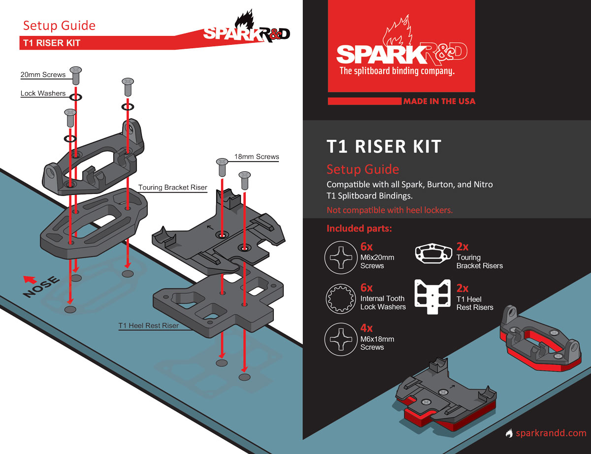 Big Feet? We got you covered. Our riser kit screws in underneath touring brackets and heel rests to raise you up. This increases the binding rotation angle while touring to prevent toe strike and increase stride length.