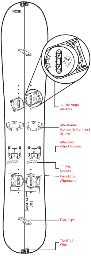 • If you have a DIY splitboard using ski screws, you will need to use 5.5 x 11.5mm ski screws for the heel rests. Longer screws that are typically used for DIY setups are too long and will bubble your base.