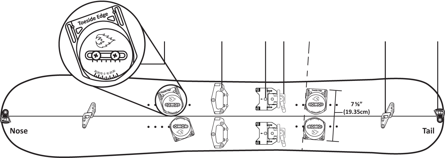• Orient the heel rests so that the arrow points toward the nose of the board. Attach heel rests with the blue patched screws.